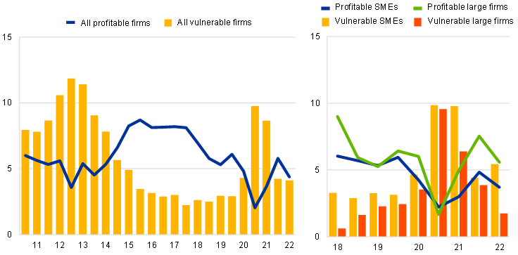 6. Vulnerable firms are defined as firms that simultaneously report lower turnover, decreasing profits, higher interest expenses and a higher or unchanged debt-to-assets ratio, while profitable firms are those that simultaneously report higher turnover and profits, lower or no interest expenses and a lower or no debt-to-assets ratio. The third (and typically largest) group consists of firms that satisfy some, but not all, conditions of the vulnerable and profitable categories. See the box entitled “Distressed and profitable firms: two new indicators on the financial position of enterprises”, Survey on the Access to Finance of Enterprises in the euro area, October 2017 to March 2018, ECB.