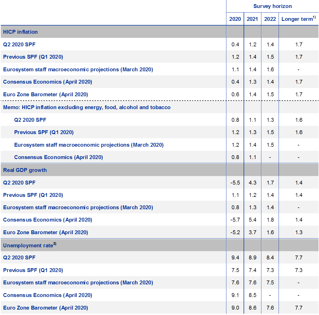 SPF GDP growth expectations now stand at -5.5% for 2020, +4.3% for 2021 and at +1.7% for 2022 (see Chart 7). These imply a downward revision of -6.1 percentage points for 2020 and an upward revision of 3.1 percentage points for 2021. The magnitude of these revisions from one round to the other is unprecedented and far stronger than during the Great Financial Crisis, when forecasters adjusted more slowly.[6] For both horizons there is large disagreement among forecasters, with standard deviations over the point forecasts standing at 2.1 percentage points for 2020 and 2.4 percentage points for 2021. For 2020, more than half of respondents expect euro area GDP to decrease by between 4% and 6% annually, while for 2021 around 40% expect euro area GDP to increase by between 4% and 6% annually. For 2022 point forecasts have been revised up on average by 0.3 percentage points Longer-term growth expectations (which refer to 2024) remained stable at 1.4%. Notwithstanding the upward revisions for 2021, 2022 and 2024, the level of GDP by 2024 is expected to be approximately 3% lower than expected in the 2020 Q1 SPF. Compared with the SPF, the April 2020 Consensus Economics has a slightly sharper slowdown in 2020 but more of a rebound in 2021 and 2022, whereas the Euro Zone Barometer has a milder slowdown but the subsequent rebound is also milder – see Table 1.
