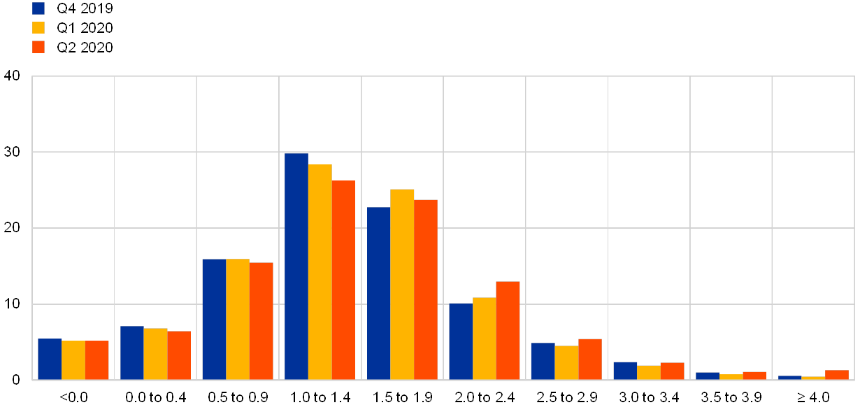 The median expectation for the rate on the ECB’s main refinancing operations was for it to remain at 0% at least until 2022. This implies a later ‘lift-off’ than was forecast in the previous round (see panel (a) of Chart 13).