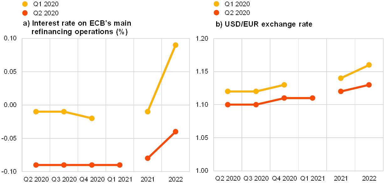 The average expected USD/EUR exchange rate was expected to appreciate marginally from around 1.10 in Q2 2020, to 1.12 in 2021 and further to 1.13 in 2022. This is slightly lower (by about 2%) than in the previous round (see panel (b) in Chart 13).