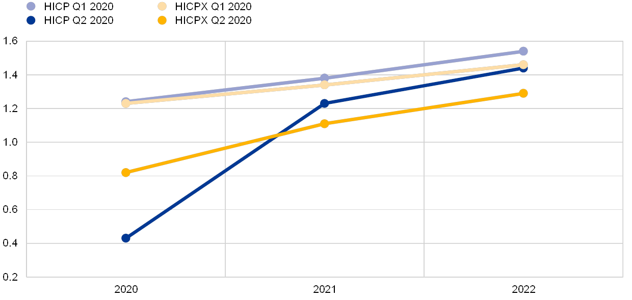 Expectations for inflation excluding energy, food, alcohol and tobacco (HICPX) were revised down for 2020, 2021 and 2022 although they continue to forecast a gradual upward movement (see Chart 2). Expectations for HICPX were revised down by 0.4 percentage points for 2020 and by 0.2 percentage points for both 2021 and 2022. Although respondents generally did not elaborate on the main factors underlying their inflation forecasts, the downward revisions clearly reflect the impact of the lower forecasts for the level of economic activity. The combination of a changed profile for assumed oil prices and weaker activity also helps explain the differences in the pattern of revisions to headline inflation and to HICPX, with revisions to the former being larger in 2020, but smaller in 2022. The SPF forecasts for HICPX are in line with those in the April 2020 Consensus Economics but considerably lower than those from the March 2020 MPE. The March MPE projections were broadly similar to those in the Q1 2020 SPF.