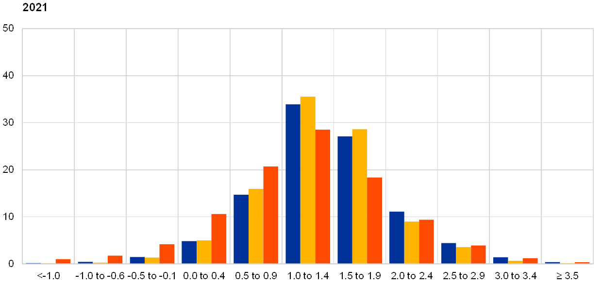 Respondents reported increased overall uncertainty surrounding the outlook for inflation and considered that the balance of risks was largely to the downside. Quantitative indicators of uncertainty for inflation derived from the reported probability distributions increased for all horizons but most noticeably for the shorter horizons.[4] For these horizons (particularly those for 2020), the increase in ‘aggregate uncertainty’ owed mainly to an increase in ‘disagreement’ across forecasters, which was much larger than the increase in ‘individual uncertainty’. For the longer horizons, the increase in aggregate uncertainty reflected a more similar increase in both disagreement and ‘individual uncertainty’.[5] The aggregate probability distributions for the calendar years 2019-2021 are presented in Chart 3).