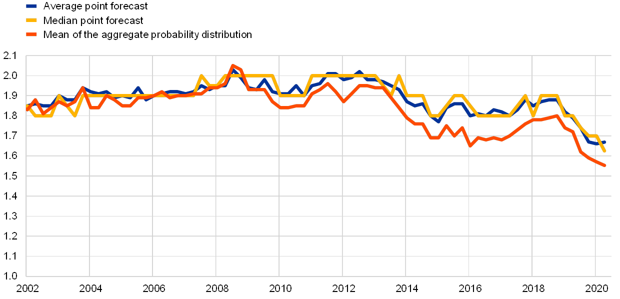 Average longer-term inflation expectations remained largely unchanged at 1.7%. Notwithstanding the substantial downward revisions to inflation forecasts over the 2020-22 horizon, longer-term expectations were not substantially changed, with the average point expectation remaining at 1.7%. However, some summary statistics declined to new lows – for example the median point forecast dropped to 1.6% and the estimated mean of the aggregate probability distribution edged down to 1.55% (from 1.57%) – see Chart 4. The distribution of individual point forecasts tilted further to values below 1.7%, with the modal value being 1.6% – see Chart 5. The longer-term expectations for HICP inflation excluding energy, food, alcohol and tobacco (HICPX) also remained unchanged, staying at 1.6%.