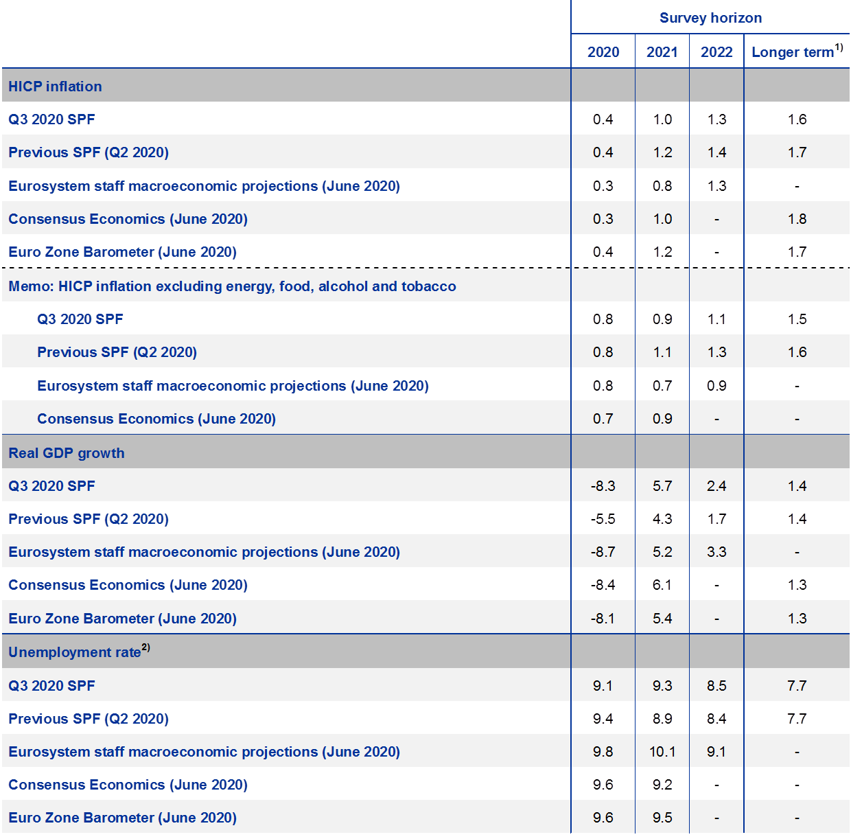1. The survey was conducted between 30 June and 6 July 2020 with 59 responses received. Participants were provided with a common set of the latest available data for annual HICP inflation (June 2020 flash estimates: overall inflation, 0.3%; underlying inflation, 0.8%), annual GDP growth (Q1 2020: -3.1%) and unemployment (May 2020: 7.4%).