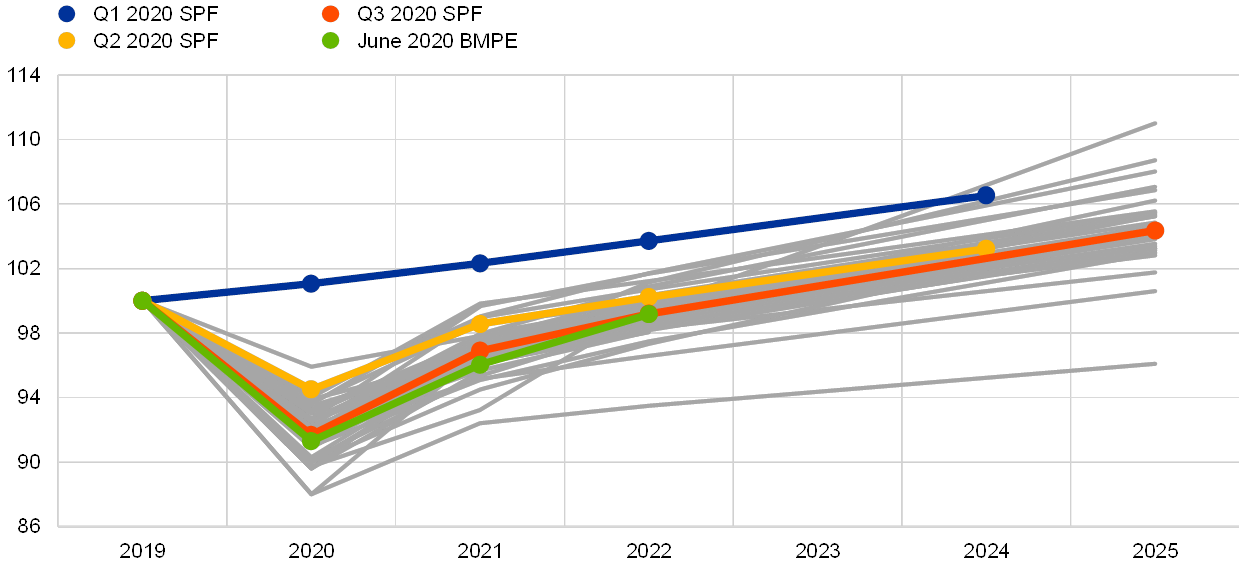 Notes: Growth expectations for years not surveyed (2023 and 2024 in the Q3 round and 2023 in the Q2 round) have been interpolated linearly. Grey lines denote individual forecaster profiles in the Q3 round. “June 2020 BMPE” denotes the June 2020 Eurosystem staff macroeconomic projections.