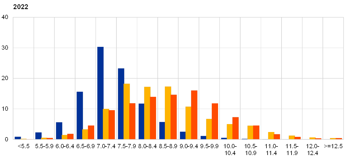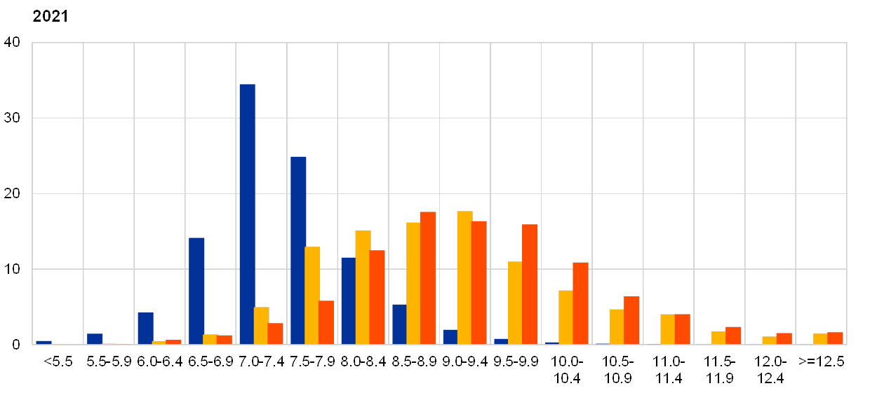 (x-axis: longer-term HICP inflation expectations, annual percentage changes; y-axis: percentages of respondents)