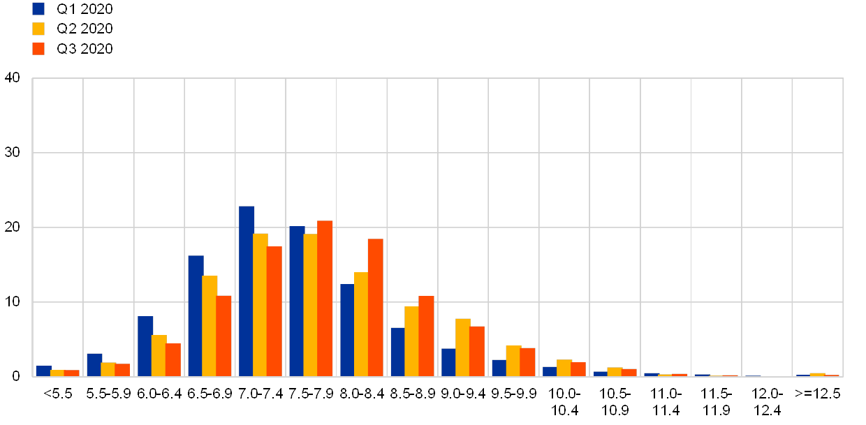 4. In anticipation of the expected substantial revisions to the growth outlook and the considerable uncertainty surrounding them (e.g. depending on the length of the containment measures and the evolution of the spread of the virus), the SPF questionnaire was adjusted at the time of the Q2 2020 round to allow for a significantly wider range of the probability distributions, with bins of 2 percentage points surrounding the regular bins of previous rounds.