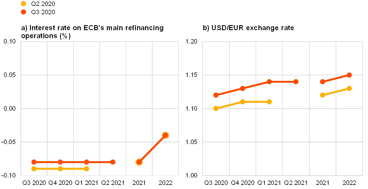 The average USD/EUR exchange rate was expected to appreciate marginally from around 1.12 in the third quarter of 2020, to 1.14 in 2021 and further to 1.15 in 2022. This is slightly higher (by about 2%) than in the previous round (see panel (b) of Chart 13).