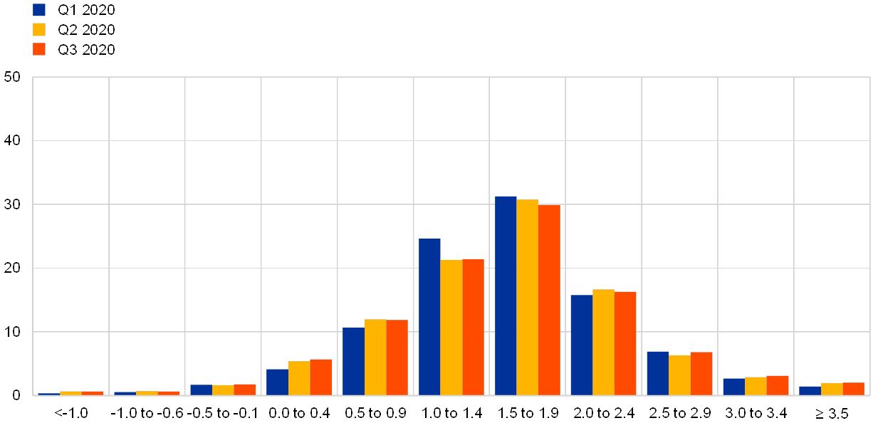 The median expectation for the rate on the ECB’s main refinancing operations was for it to remain at 0% at least until 2022. As a small number (around 15%) of respondents reported expectations of negative rates, the average (mean) expectation is slightly negative. Overall, rate expectations are essentially unchanged from the previous round (see panel (a) of Chart 13).