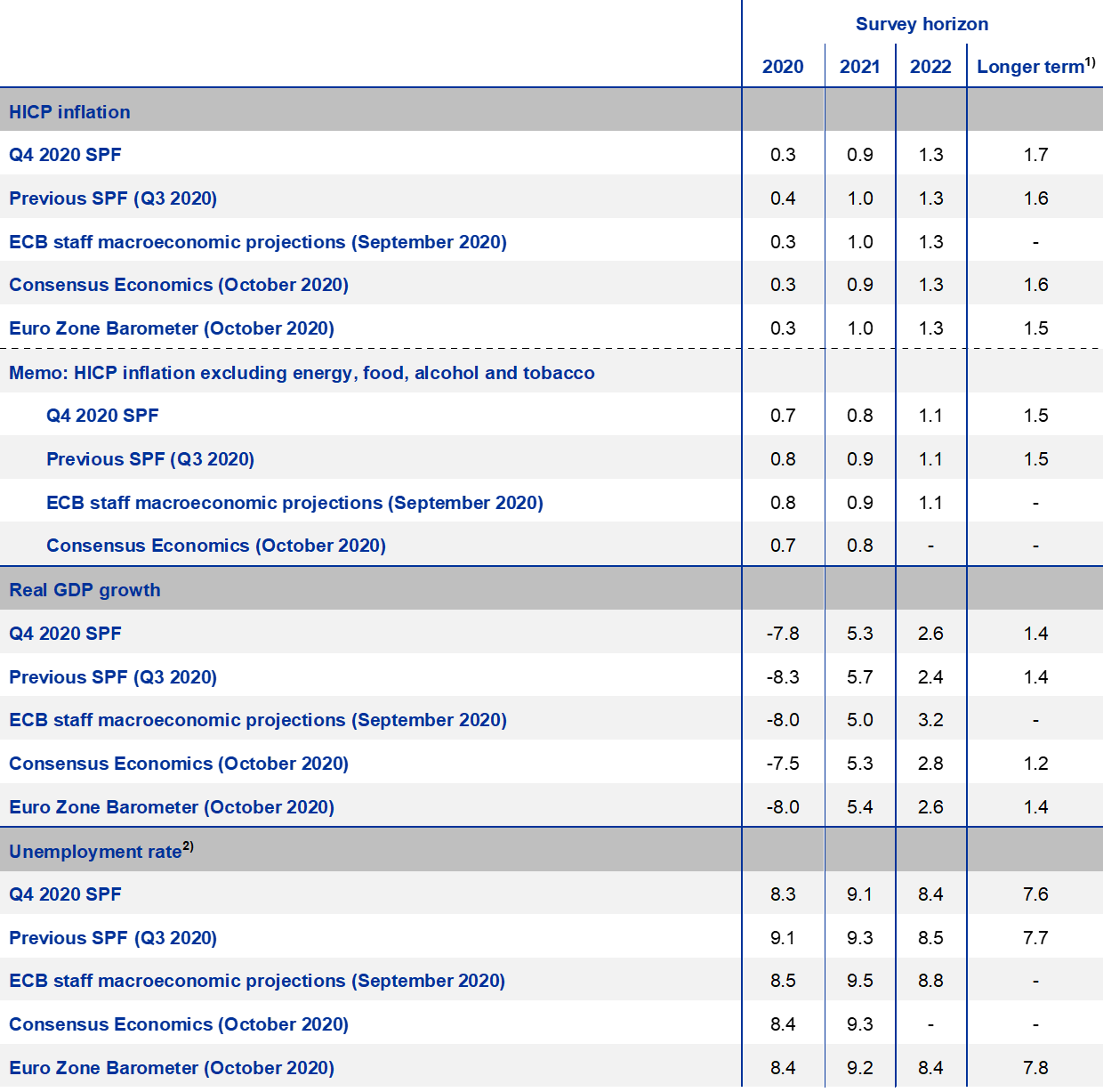 1. The survey was conducted between 2 and 9 October 2020 with 66 responses received. Participants were provided with a common set of the latest available data for annual HICP inflation (September 2020 flash estimates: overall inflation, -0.3%; underlying inflation 0.2%), annual GDP growth (second quarter of 2020, -14.7%) and unemployment (August 2020, 8.1%).