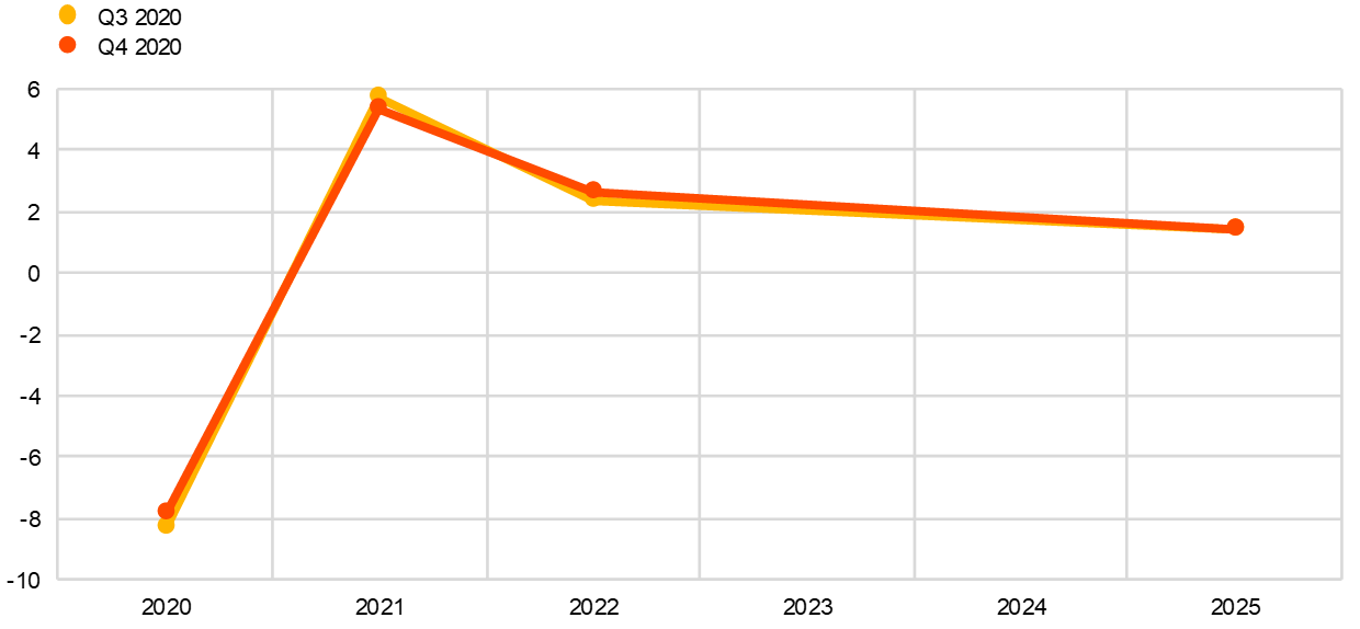 The average USD/EUR exchange rate was expected to appreciate very marginally, from around 1.18 in the fourth quarter of 2020 to 1.19 in 2021, and further to 1.20 in 2022. This is slightly higher (by about 4%) than in the previous round (see panel (b) of Chart 13).