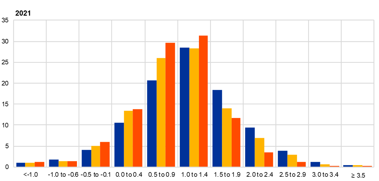 The median expectation for the rate on the ECB’s main refinancing operations was for it to remain at 0% at least until 2022. As a small number (around 5%) of respondents reported expectations of negative rates, the average (mean) expectation is slightly negative. Overall, rate expectations were essentially unchanged from the previous round (see panel (a) of Chart 13).