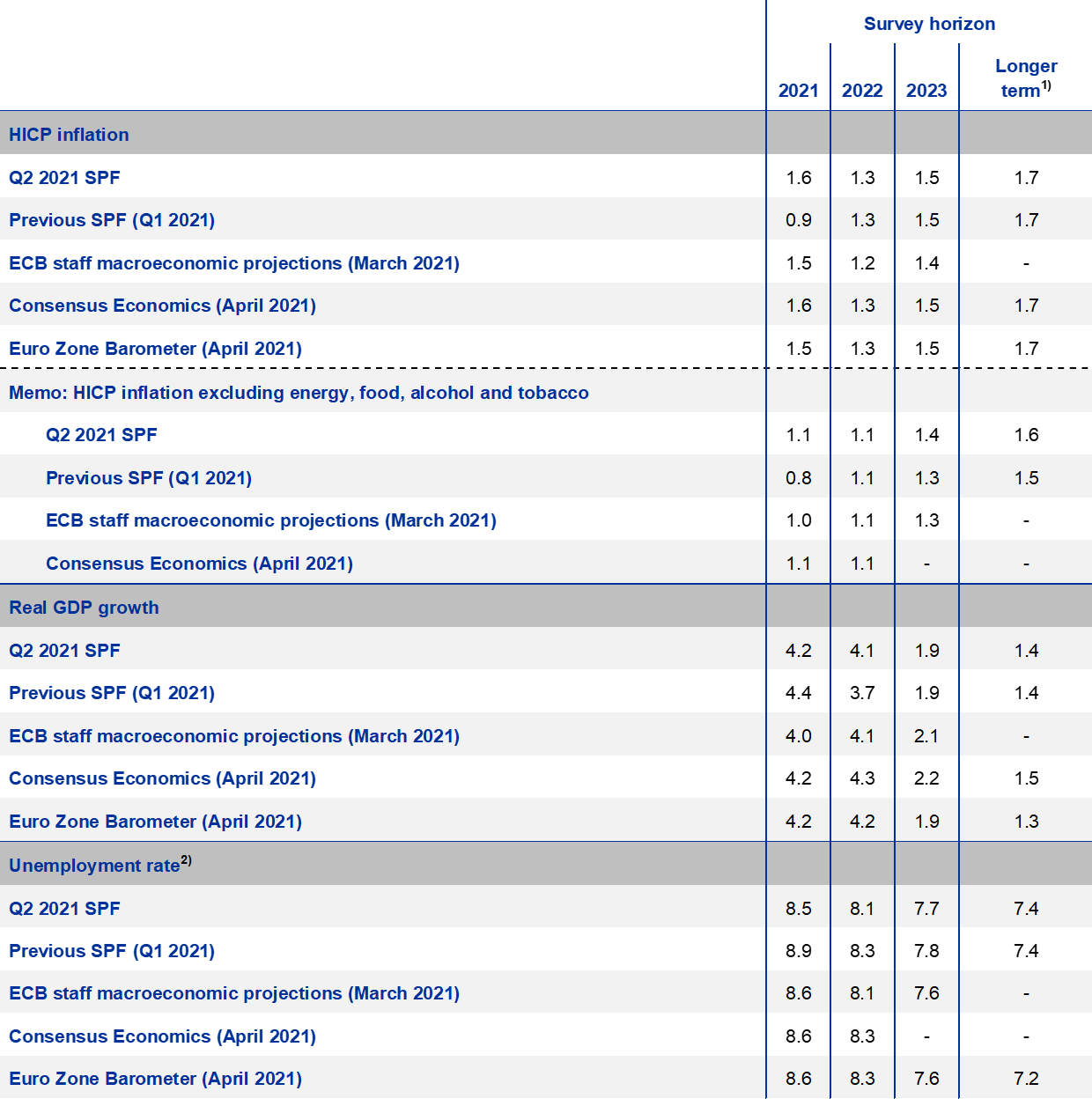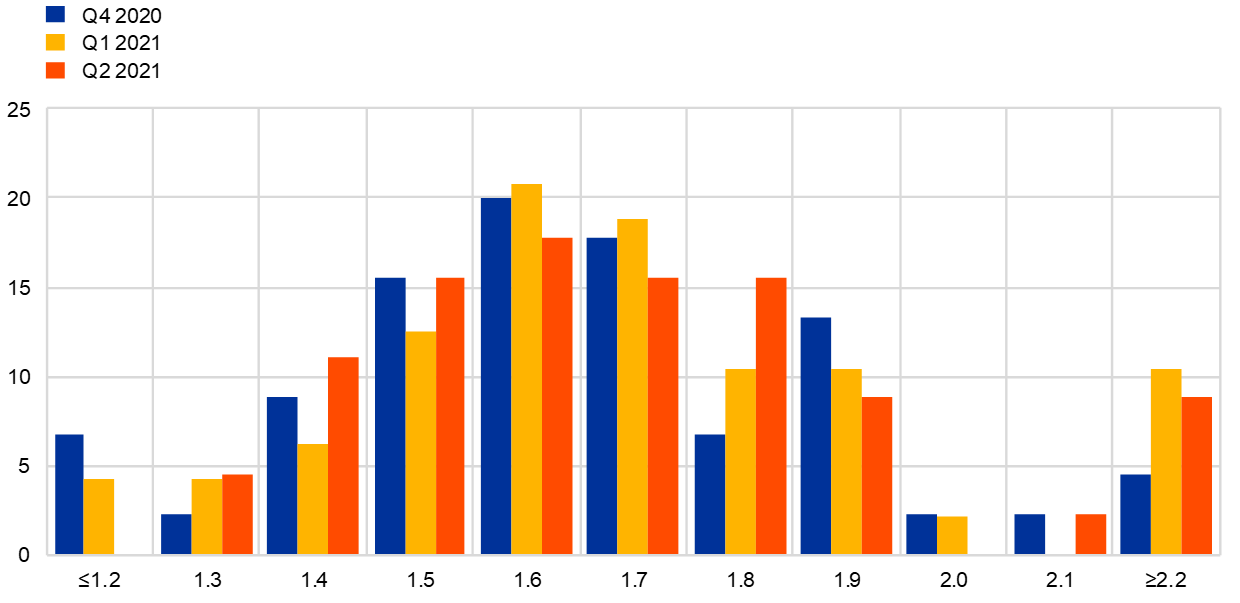 SPF inflation expectations were revised upward for 2021 but kept largely unchanged thereafter. Average inflation expectations for 2021, 2022 and 2023 were 1.6%, 1.3% and 1.5% respectively (see Chart 1). For 2021 these were revised upward (by 0.7 percentage point) from the previous round but they were unchanged for 2022 and 2023. Compared with the March 2021 ECB staff macroeconomic projections, inflation expectations were slightly higher, by 0.1 percentage point, for each year from 2021 to 2023 (see Table 1).