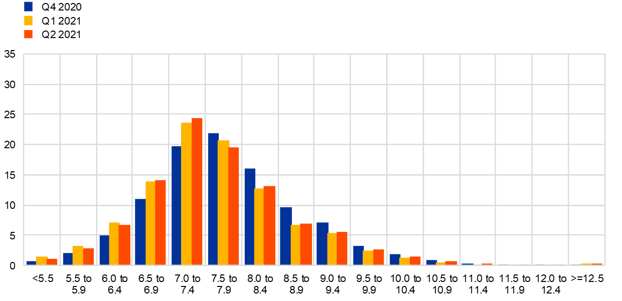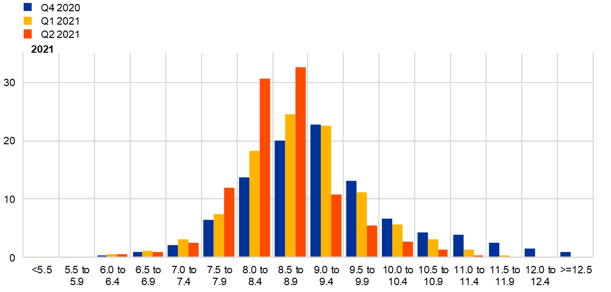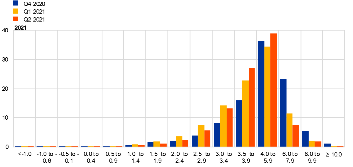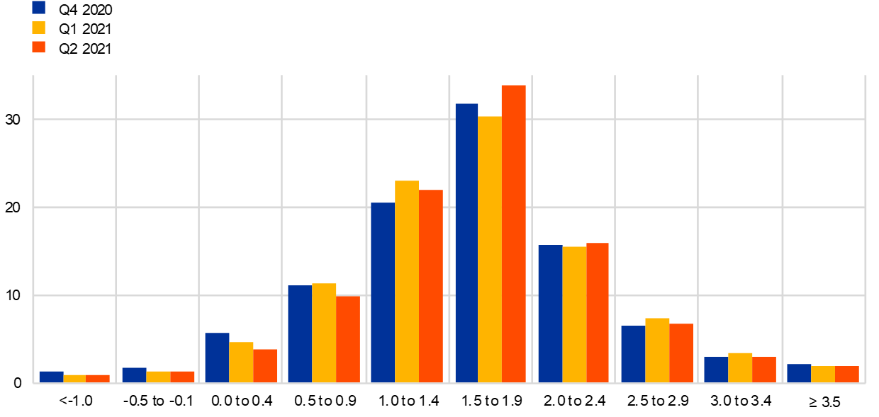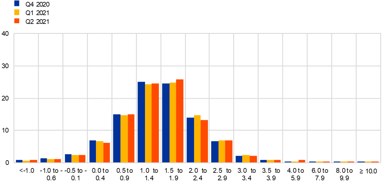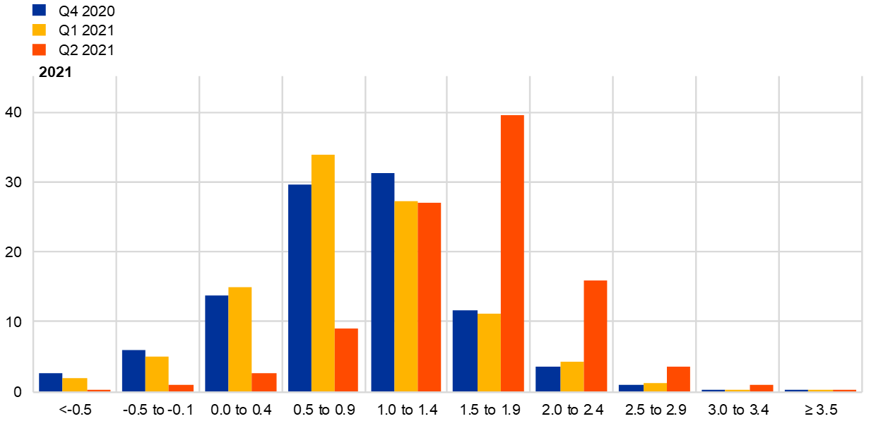 Quantitative indicators of perceived uncertainty eased back somewhat further and risks were assessed to have remained broadly balanced. The main source of uncertainty remained the evolution and impact of the pandemic. While third waves of the pandemic and intensified lockdowns cloud the near-term inflation outlook (downside risk), some respondents believed there could be an upward impact should vaccination rollout efforts prove successful and pent-up demand be released (upside risk). Quantitative indicators of uncertainty for inflation derived from the reported probability distributions eased somewhat further. The width of the reported probability distributions indicates the perceived degree of uncertainty, whereas the asymmetry of the distributions indicates whether that uncertainty is more concentrated on higher or lower outturns, i.e. it measures the perceived balance of risks. The aggregate probability distributions for the calendar years 2021-23 are presented in Chart 2. For 2021, the modal bin range (i.e. the one with the largest associated probability) shifted to 1.5-1.9% (from 0.5-0.9%), while the probability mass in the modal bin range for 2022 (1.0-1.4%) remained largely unchanged.
