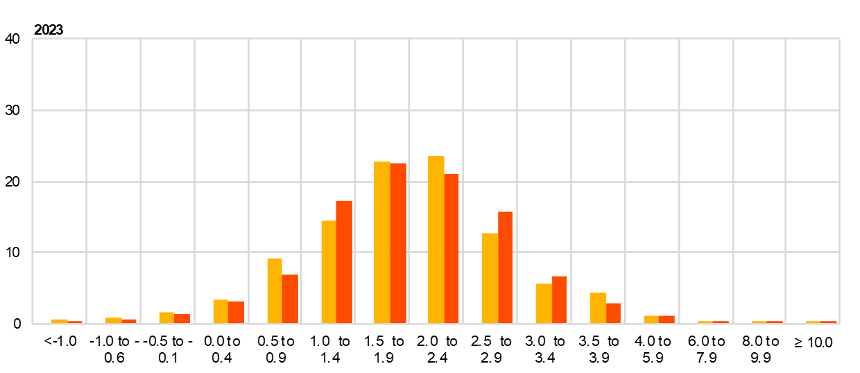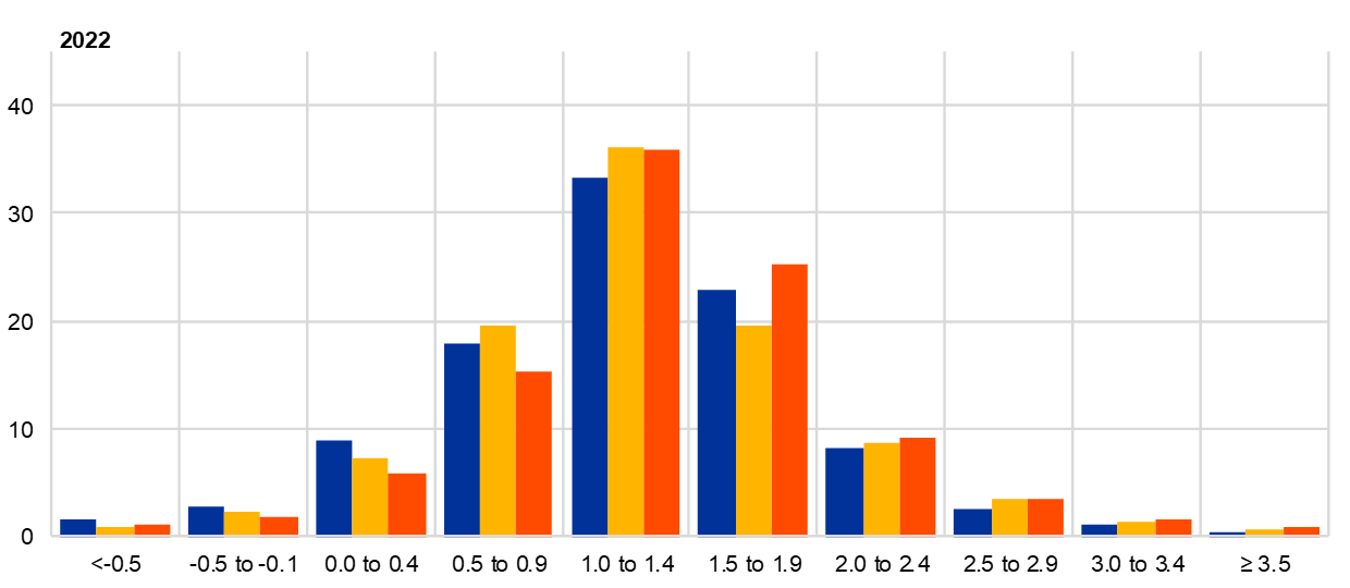 Uncertainty surrounding longer-term inflation expectations moderated slightly further, albeit remaining elevated, and the balance of risks stayed to the downside. In line with uncertainty indicators for shorter horizons, there was some moderation in the standard deviation of the aggregate probability distribution (although it remained at a relatively high level by historical standards). The balance of risks remained clearly to the downside, albeit to a slightly lesser degree than in the previous round. The probability associated with longer-term inflation being negative remained unchanged from the previous round at 2% (see Chart 5).
