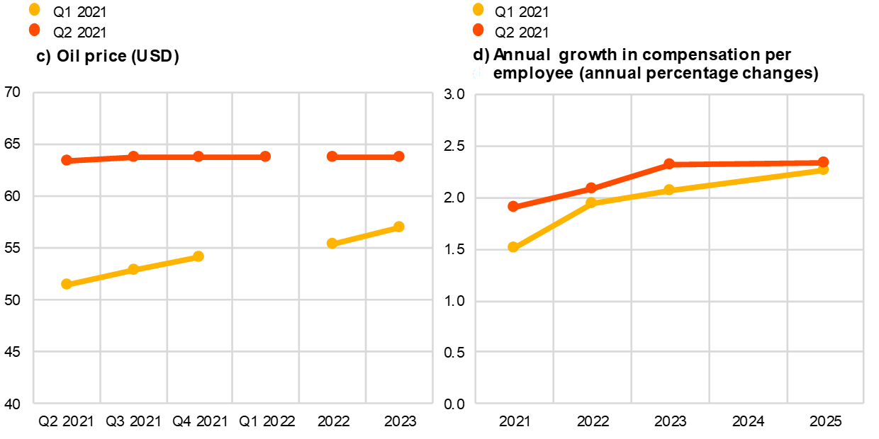 The average USD/EUR exchange rate was expected to remain broadly constant over the reported period – moving from 1.19 in the second quarter of 2021 to 1.20 in the third quarter of 2021 and thereafter. This profile was slightly lower compared with the previous SPF round (see panel (b) of Chart 14).