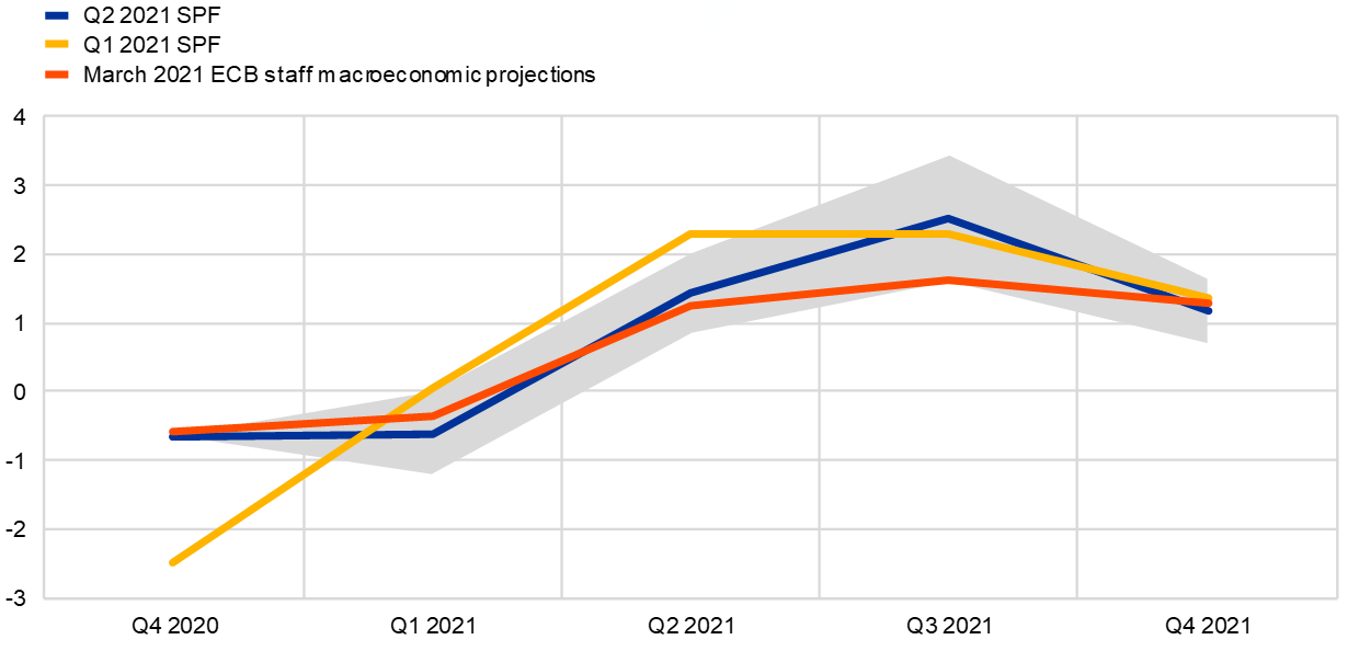 Respondents were again asked to specifically discuss the profile of their short-term GDP outlook. More than 50 respondents provided their expected quarterly profile of quarter-on-quarter GDP growth from the first to the fourth quarter of 2021. On average, they expected real GDP to have declined by 0.6% in the first quarter of 2021 and to increase by 1.4% in the second quarter of 2021, implying downward revisions by 0.7 and 0.9 percentage point, respectively (see Chart 7). For the third and fourth quarters, their expectations remained broadly in line with those in the previous survey round, that is quarter-on-quarter growth of 2.5% and 1.2%, respectively. This short-term pattern reflected the slower rollout of vaccinations in the first months of 2021 as well as renewed lockdown measures but also more confidence that the expected recovery will materialise as containment restrictions are gradually lifted. Compared with the March 2021 macroeconomic projection exercise, SPF respondents were on average more optimistic for the third quarter of 2021 and broadly in line with the other quarters (see Chart 7).