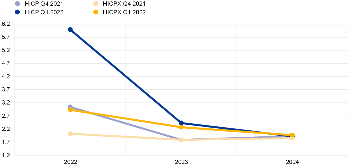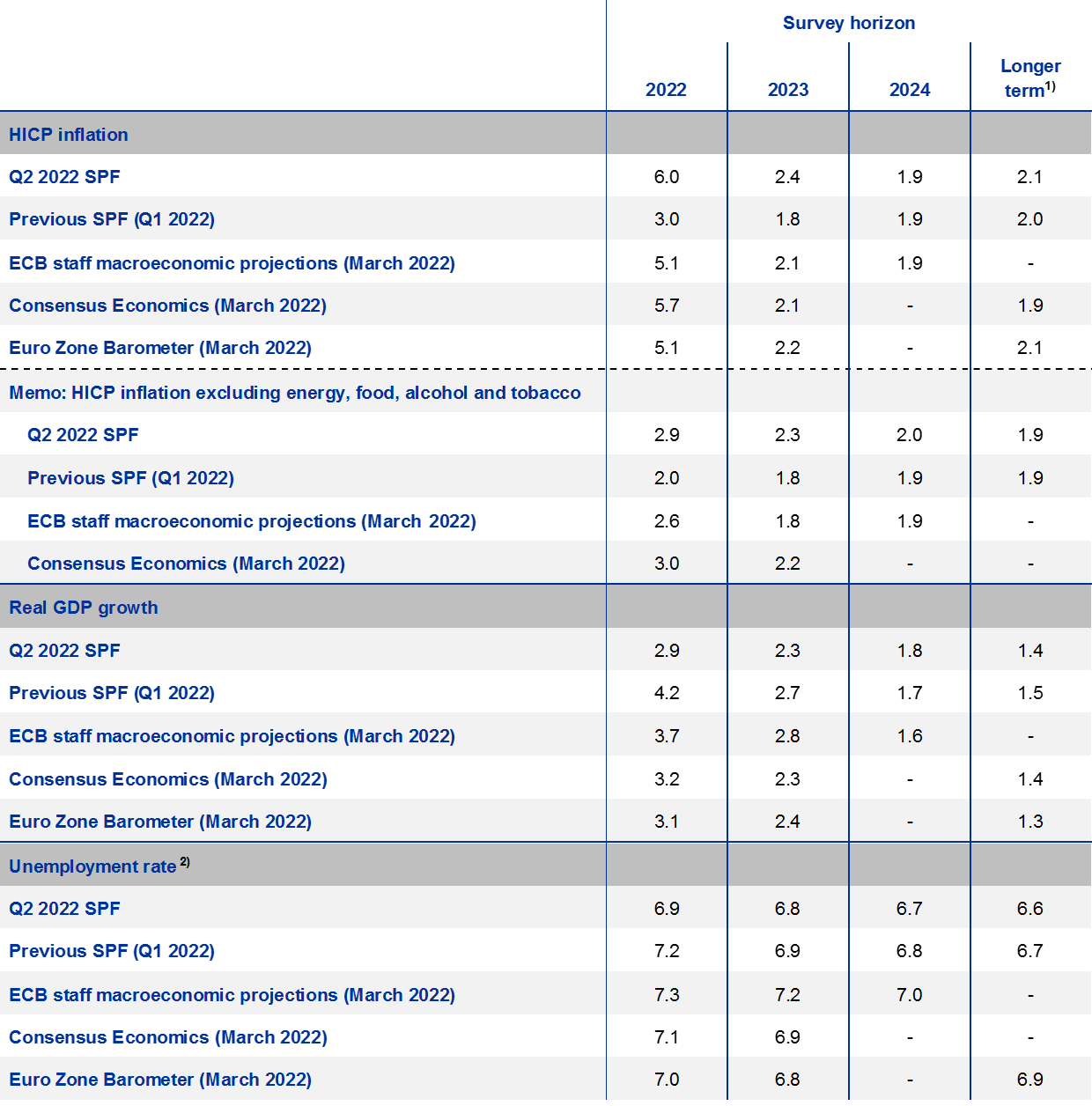 SPF expectations for inflation excluding energy, food, alcohol and tobacco (HICPX) were also revised up, particularly for 2022 and 2023. HICPX expectations for 2022, 2023 and 2024 stood at 2.9%, 2.3% and 2.0% respectively, representing upward revisions of 0.9 percentage points for 2022, 0.5 percentage points for 2023 and 0.1 percentage points for 2024. Respondents indicated that the upward revisions reflect a higher starting point as well as indirect effects from higher energy and food prices and effects from supply chain disruptions. HICPX inflation is still expected to ease back toward 2.0% by 2024. The SPF forecasts for HICPX were higher than those from the March 2022 ECB staff macroeconomic projections for 2022, 2023 and 2024, by 0.3, 0.5 and 0.1 percentage points respectively (see Table 1).