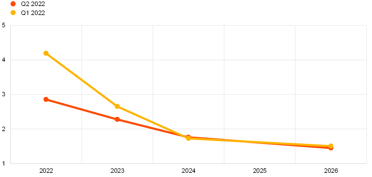 GDP growth expectations in the Q2 2022 survey round stood at 2.9% for 2022, at 2.3% for 2023 and at 1.8% for 2024 (see Chart 6). These imply downward revisions compared with the previous round of 1.3 percentage points for 2022 and 0.4 percentage points for 2023, but a small upward revision of 0.1 percentage points for 2024. Almost all respondents attributed their downward revisions to the repercussions of the Russian invasion of Ukraine. Aside from higher energy and food commodity prices, disruptions in some sectors and the sanctions imposed, they noted that the situation had resulted in falls in business and consumer confidence and loss of purchasing power for households. The new partial lockdowns in China (in response to coronavirus outbreaks there) were also mentioned as a factor contributing to prolonged supply chain disruptions and an additional economic headwind. Respondents decidedly pointed to downside risks to growth from economic sectors most affected by increased energy prices, such as manufacturing, which could be long-lasting. Going forward, risks are seen on the downside, particularly if the war’s duration is longer than assumed as well as with respect to the development of energy prices and supply bottlenecks. Upward risks mentioned were a quick resolution of the war as well as possible mitigation of the worst effects of high energy prices from fiscal interventions. Longer-term growth expectations (which refer to 2026) were marginally (by 0.1 percentage point) lower at 1.4%.