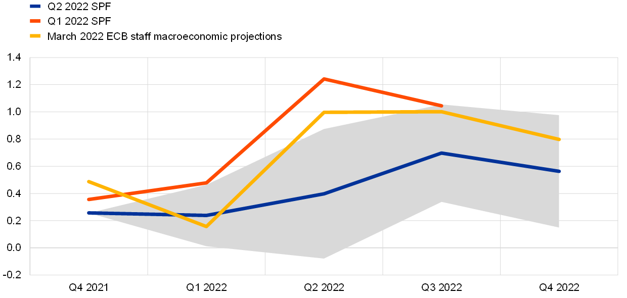 Respondents revised down the profile of their short-term GDP outlook in particular for the second quarter of 2022.[4] Actual quarter-on-quarter real GDP growth for the fourth quarter of 2021 was 0.3%, similar to the forecast of 0.4% in the first quarter of 2022 round.[5] In this round, forecasters expected quarter-on-quarter growth in the first quarter of 2022 to remain modest at 0.2% and to increase only slightly to 0.4% in the second quarter of 2022 (previously they expected an increase from 0.5% to 1.0%). Growth is then expected to move further up in 20022 Q3 and 2022 Q4, at 0.7% and 0.6% respectively (see Chart 7). Although one quarter of the forecasters who provided a forecast quarterly growth profile see at least one quarter of negative growth between the first and fourth quarters of 2022, only 4% forecast a technical recession (two consecutive quarters of negative growth). Compared with the March 2022 ECB staff macroeconomic projections, respondents were on average of the same opinion for the first quarter of 2022, and more pessimistic for the rest of 2022.