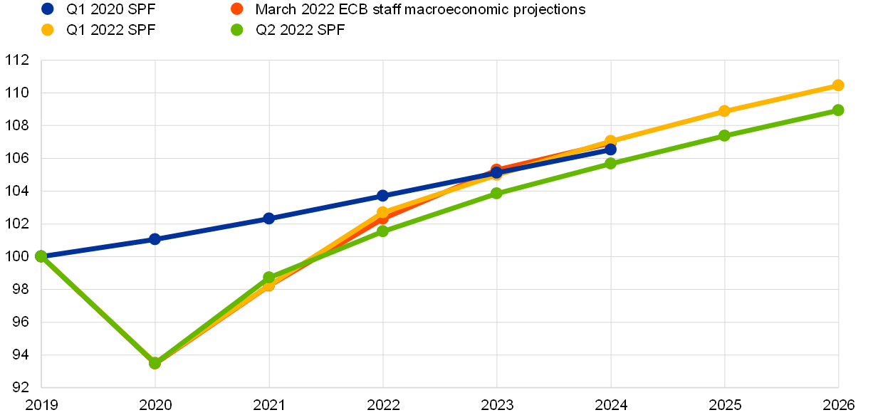 1. The survey was conducted between 1 and 4 April 2022, with 58 responses received – this is in line with the historical average response rate. Participants were provided with a common set of the latest available data for annual HICP inflation (March 2022 flash estimates: overall inflation, 7.5%; underlying inflation, 3.0%), annual GDP growth (fourth quarter of 2021, 4.6%) and unemployment (February 2022, 6.8%).