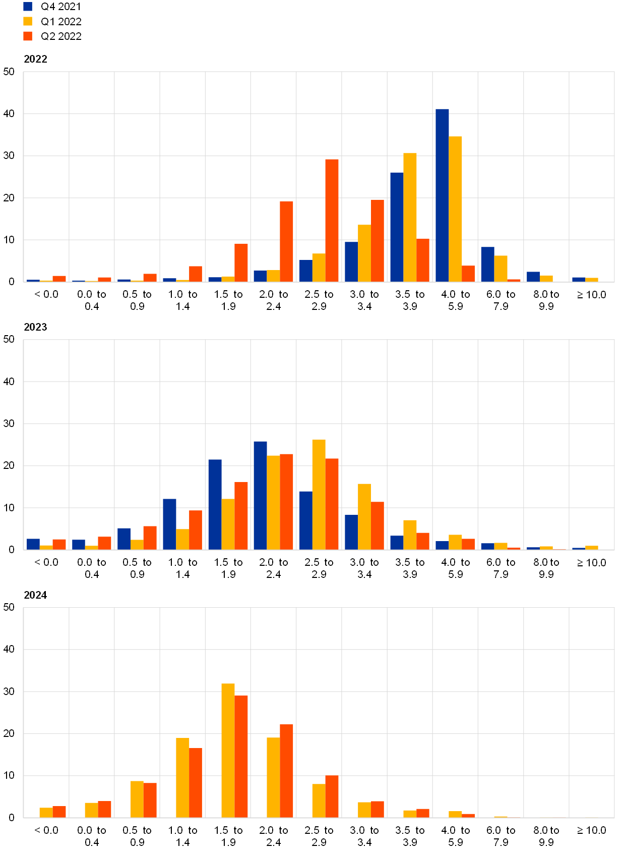 Notes: The SPF asks respondents to report their point forecasts and to separately assign probabilities to different ranges of outcomes. This chart shows the average probabilities they assigned to different ranges of inflation outcomes in 2022, 2023 and 2024. To minimise changes to the questionnaire, the upper bin for inflation outcomes was not changed. The fact that this would lead to most probability being assigned to the upper bin for 2022 was flagged to respondents when sending out the questionnaire. Expectations for 2024 were not surveyed in the Q4 2021 round.