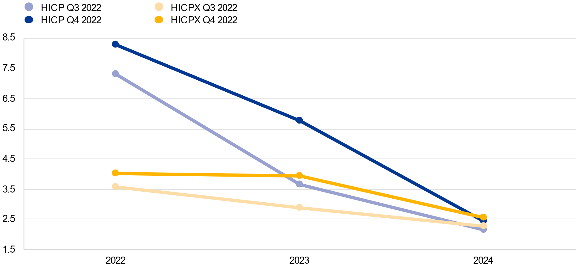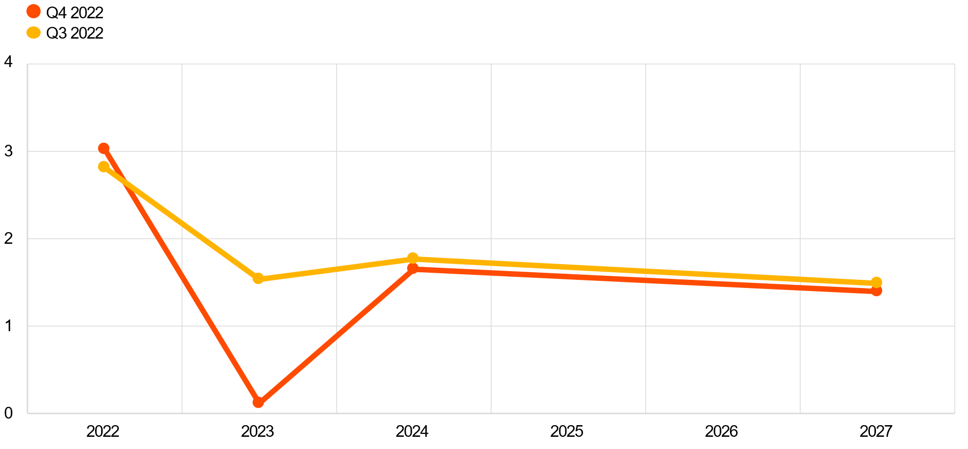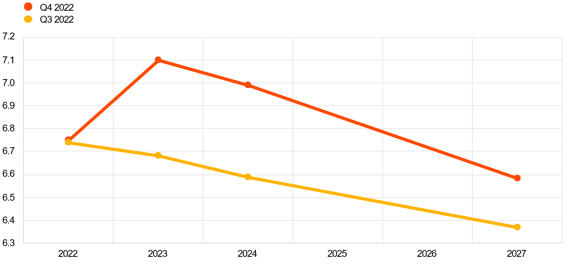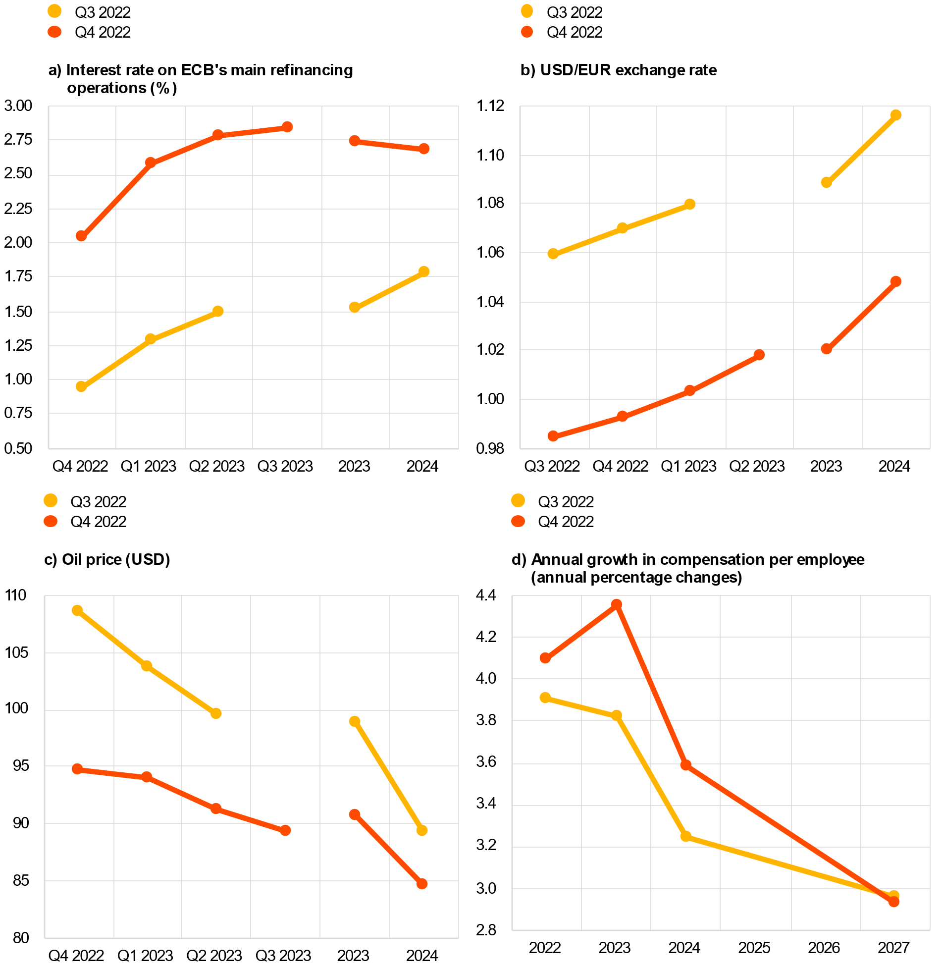 Forecasters expected: the ECB’s key main refinancing operations (MRO) interest rate to increase steadily from 2.0% in the fourth quarter of 2022 to 2.6% in the first quarter of 2023 and stabilise at around an average of 2.7% until 2024; the euro to marginally appreciate against the dollar from 0.98 in the fourth quarter of 2022 to 1.05 in 2024; oil prices to progressively decrease to levels around USD 85 per barrel until 2024; and nominal wage growth to increase at a rate higher than 4% until 2023 but to moderate to below 3% in the long-term.