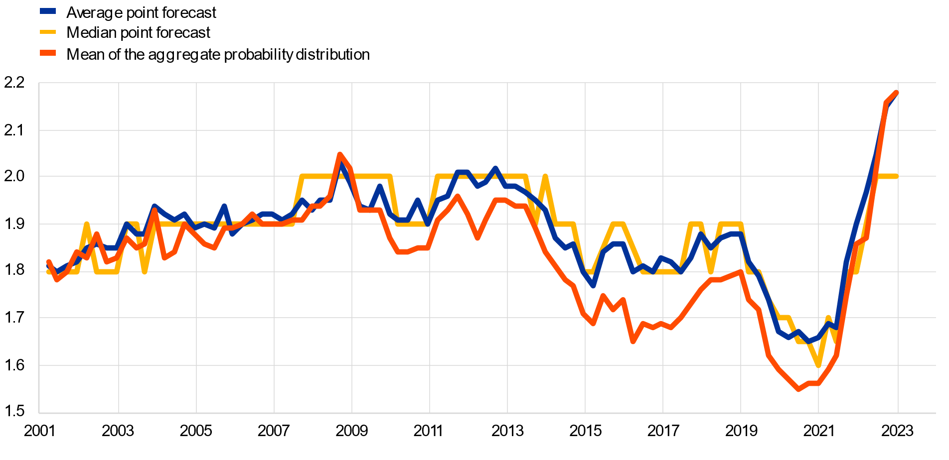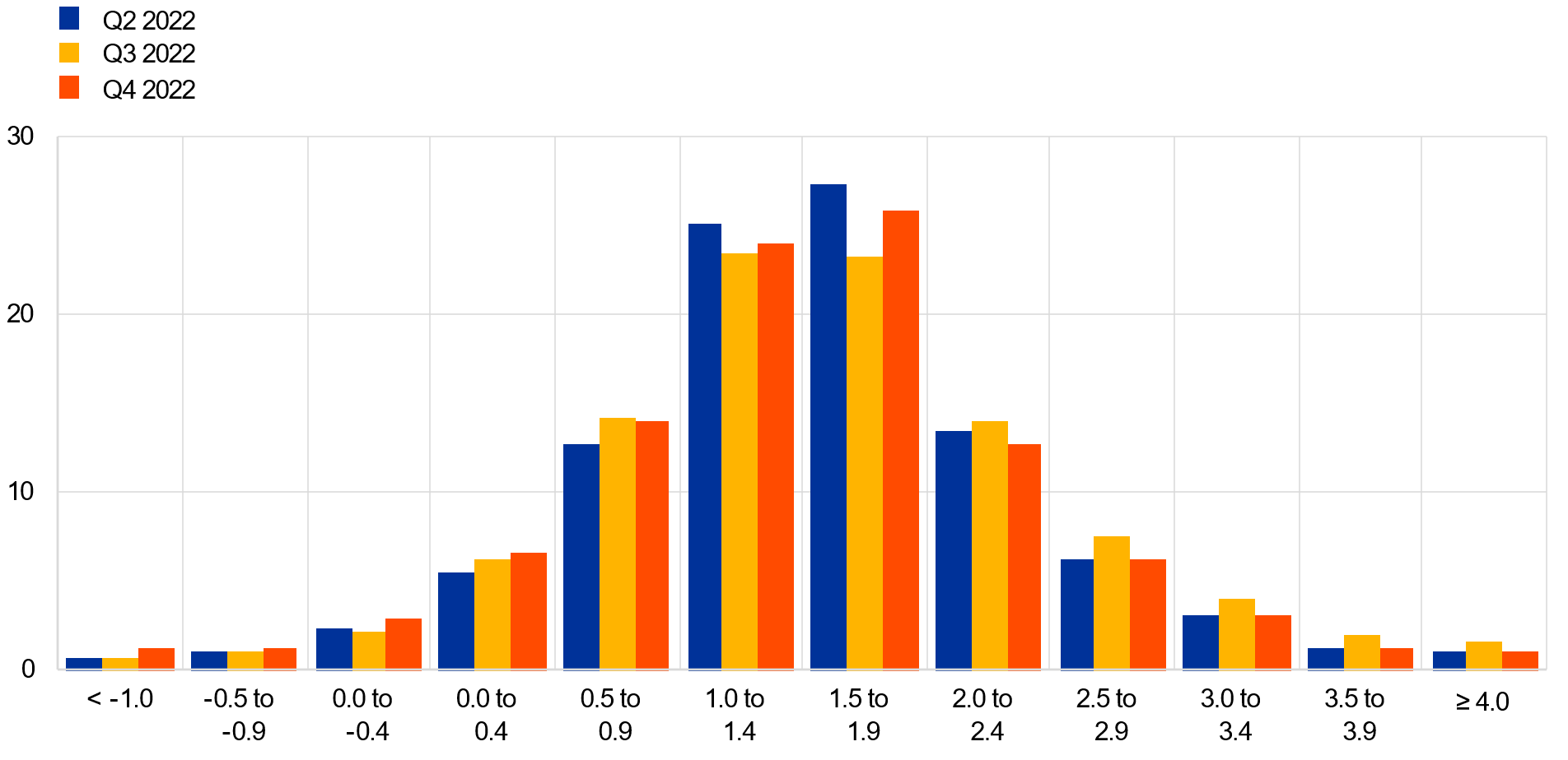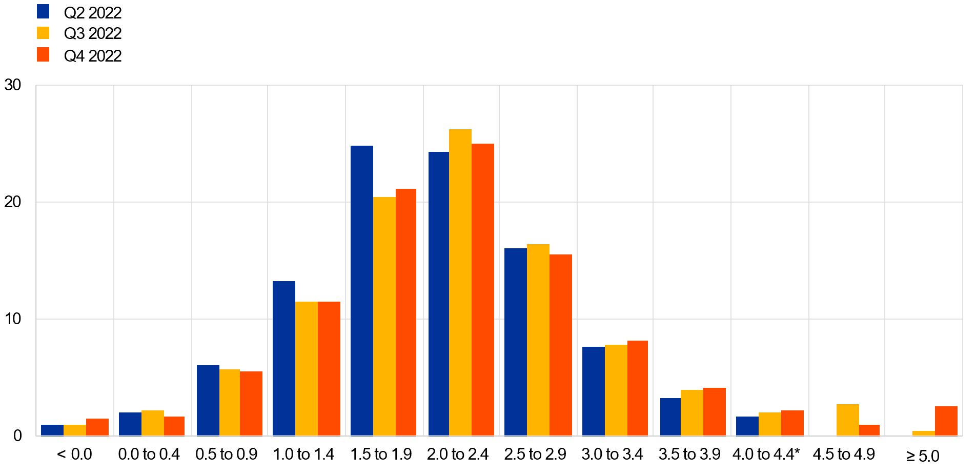 Longer-term inflation expectations (for 2027) were unchanged at 2.2%. With a trimmed mean, where the highest response and the two lowest responses are removed, in both the current and previous rounds, the average would be unchanged at 2.1%. The median (and modal) point expectation was unchanged at 2.0%. The estimated mean of the aggregate probability distribution was unchanged at 2.2% (see Chart 3). In the most recent round (fourth quarter of 2022), considering a balanced panel of 38 respondents who also replied in the previous round, nine respondents revised their longer-term inflation expectations downwards and nine revised their expectations upwards, while 20 respondents reported unchanged longer-term inflation expectations. The average expectation of this balanced panel was also unchanged at 2.2%. The distribution of individual point forecasts was broadly unchanged in this round (see Chart 4). Similar to the previous two rounds, there was again a number of respondents who reported longer-term inflation expectations at or above 2.5% (7, or 16%, in the fourth quarter of 2022 round compared with 8, or 17%, in the third quarter of 2022 round).