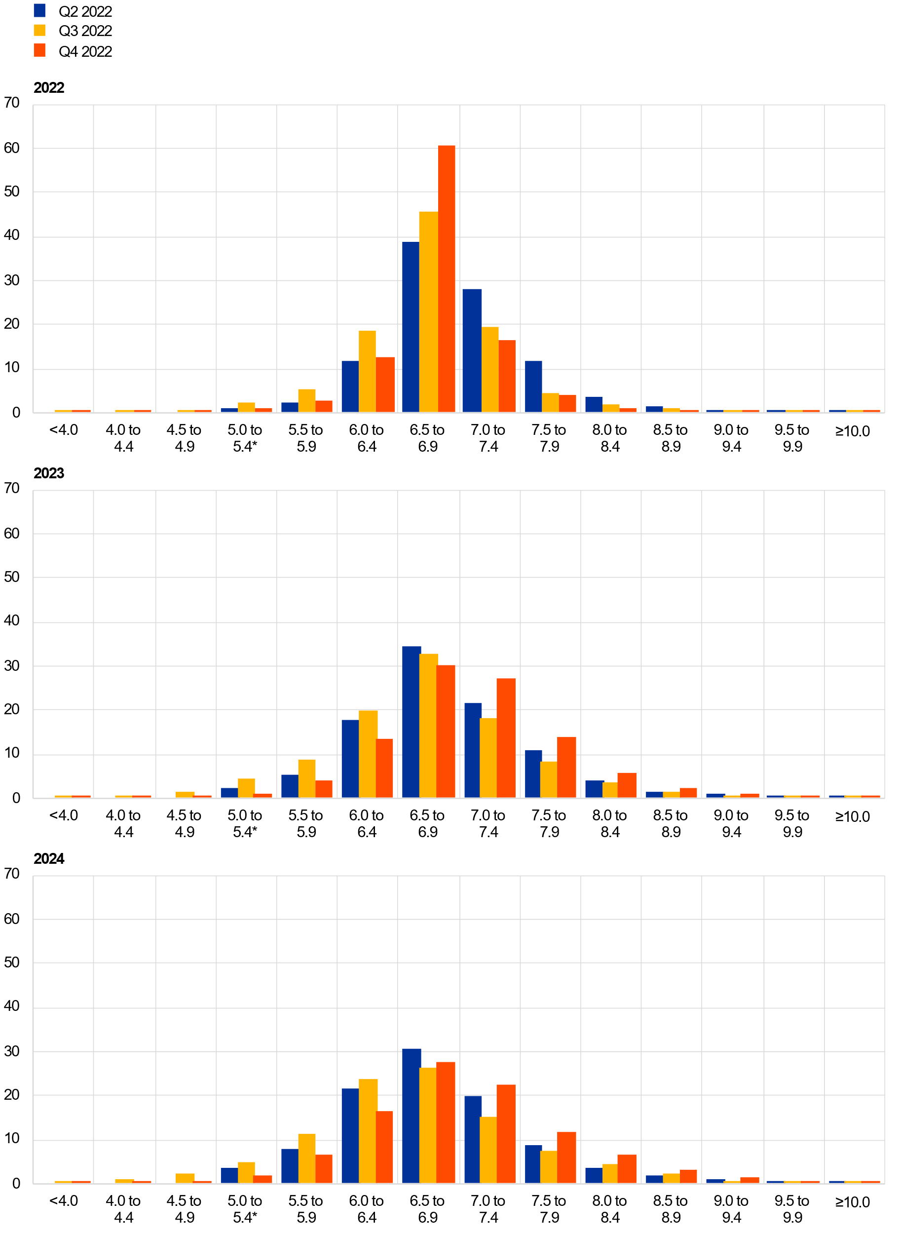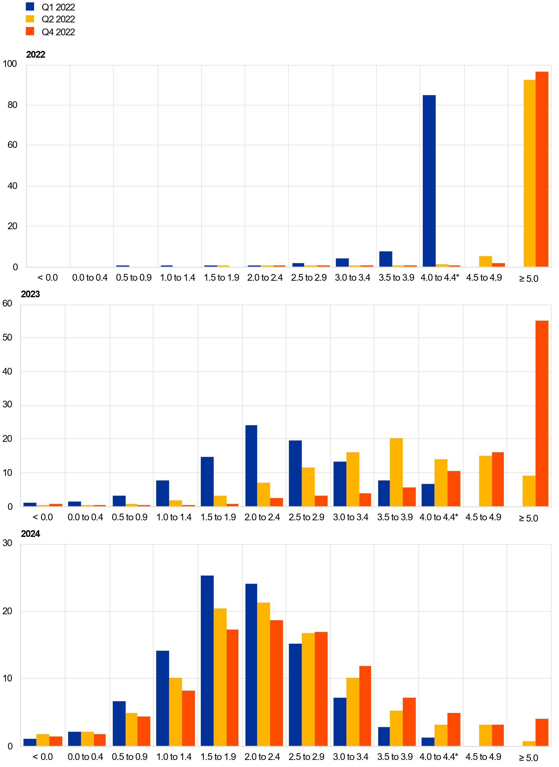 Notes: The SPF asks respondents to report their point forecasts and to separately assign probabilities to different ranges of outcomes. This Chart shows the average probabilities they assigned to different ranges of inflation outcomes in 2022, 2023 and 2024. To minimise the number of bins in the questionnaire, the upper bin for inflation outcomes was set to ≥ 5.0%. The fact that this would lead to most probability being assigned to the upper bin for some horizons was flagged to respondents when sending out the questionnaire. *The highest bin used in the second quarter of 2022 rounds was ≥4.0%.