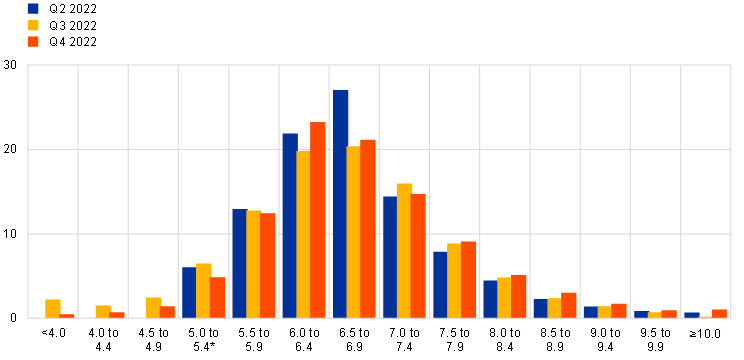 3. It is assumed that the midpoint of the open-ended interval lies 0.5 percentage points (the width of the bins provided) above/below the midpoint of the interval below/above. For example, the midpoint of the bin >5% is assumed to be 5.2%, which is 0.5 percentage points above the midpoint of 4.7% of the bin below, i.e. 4.5-4.9%.
