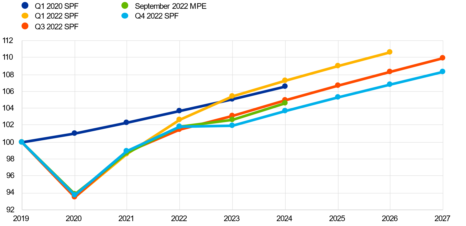 Although real GDP returned to above its pre-pandemic level in the fourth quarter of 2021, the strong downward revision to expected growth in 2023 have again delayed its expected return to the pre-pandemic profile (see Chart 8). Compared with the profile expected in the first quarter of 2022 round (conducted in early January, before Russia’s invasion of Ukraine) where it was expected to overtake the pre-pandemic trend during the course of 2023, the level profile of GDP has been revised down (by about 4% in 2026). Expected GDP levels are also lower than forecast in the September macroeconomic projection exercise (by about 1% in 2024).