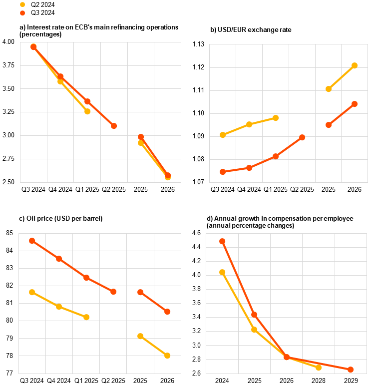 Forecasters expected the interest rate on the ECB’s main refinancing operations (MROs) to fall to 4.0% in the third quarter of 2024, 3.5% in the fourth quarter of 2024, 3.0% in 2025 and 2.5% in 2026. They expected the euro to appreciate marginally against the US dollar, from 1.07 in the third quarter of 2024 to 1.10 in 2026, and oil prices to fall from USD 85 per barrel in third quarter of 2024 to USD 81 per barrel by 2026. They also expected nominal wages to increase by 4.5% in 2024, with wage growth subsequently moderating to 3.4% in 2025, 2.9% in 2026 and 2.7% in the longer term.