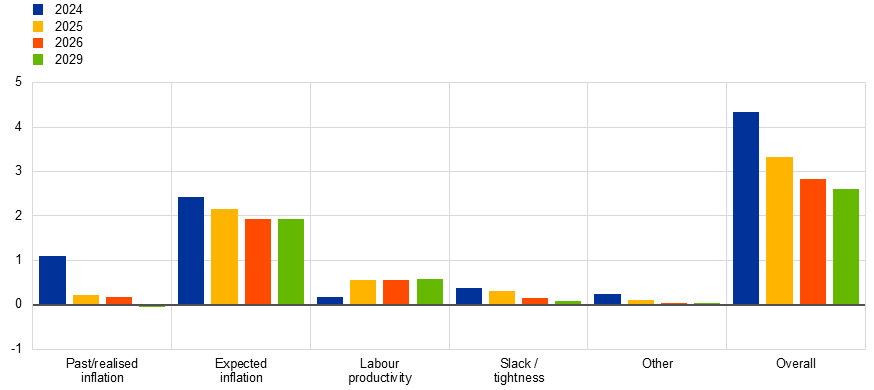 Chart A shows the decomposition across the different horizons. Clearly, inflation is the main factor driving expected labour cost growth, but its importance is expected to decline, from 3.5 percentage points in 2024 to 2.4 in 2025, 2.1 in 2026 and 1.9 in 2029. The contribution of expected inflation declines from 2.4 percentage points in 2024 to 2.1 in 2025 and around 1.9 thereafter.[9] The additional contribution of past/realised inflation (estimated as a residual) declines from 1.1 percentage points in 2024 to 0.2 in 2025 and 2026 and around 0.0 in 2029. This suggests that, while inflation compensation played a strong role up to 2024, it will not be a prominent factor going forward. The contribution from labour productivity is expected to increase from 0.2 percentage points in 2024 to around 0.6 thereafter. The contribution from labour market tightness is expected to decrease from 0.4 percentage points in 2024 to 0.3 in 2025 and around 0.1 in 2026 and 2029. Other factors contribute 0.2 percentage points in 2024, 0.1 in 2025 and around 0.0 in 2026 and 2029. Among factors mentioned were ageing/demographics and de-globalisation. This disappearing impact of labour market tightness and other factors in the longer term is in line with the notion that, in steady state, wage growth primarily reflects the inflation target and productivity growth.