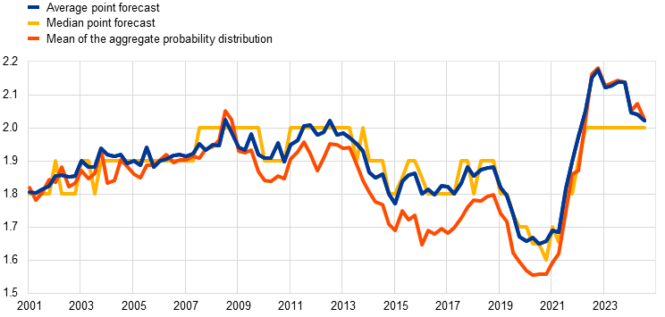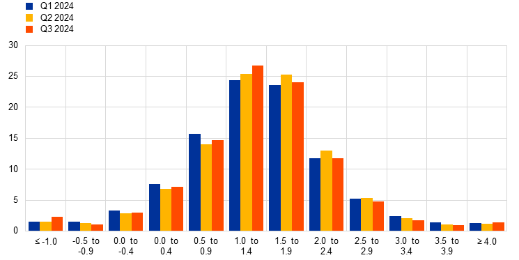 SPF respondents’ headline inflation expectations over the short and medium term were broadly unchanged, albeit slightly lower for 2026. Inflation expectations for 2024 and 2025 remained unchanged at 2.4% and 2.0% respectively, while they edged down (by 0.1 percentage points) to 1.9% for 2026 (see Chart 1). The main factors explaining this profile were similar to the previous round. Unit labour cost growth was expected to moderate due to slower wage growth and higher labour productivity growth, given the anticipated upswing in economic activity.[2] Profit margins were expected to be restrained owing to the negative output gap and to absorb some of the labour cost pressures. Compared with the June 2024 Eurosystem staff macroeconomic projections, inflation expectations in this SPF round were 0.1 percentage points lower for 2024, 0.2 percentage points lower for 2025, but unchanged for 2026 (see Table 1).