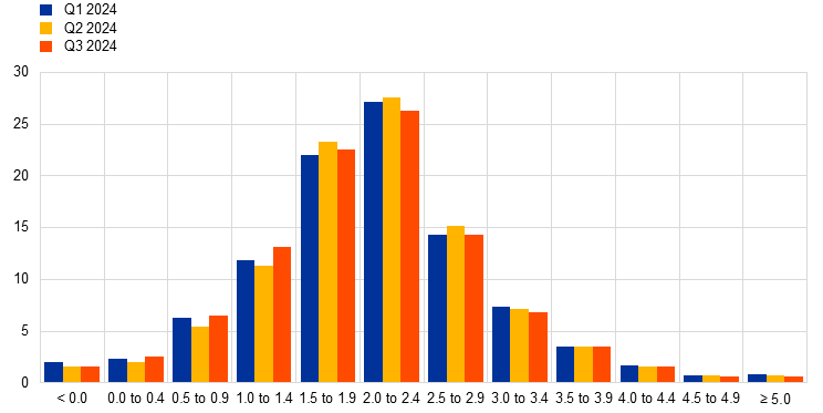 Notes: The SPF asks respondents to report their point forecasts and to separately assign probabilities to different ranges of outcomes. This chart shows the average probabilities assigned to different ranges of inflation outcomes in the longer term. In the Q3 2024 round, longer-term expectations refer to 2029; in the Q1 and Q2 2024 rounds, they referred to 2028.